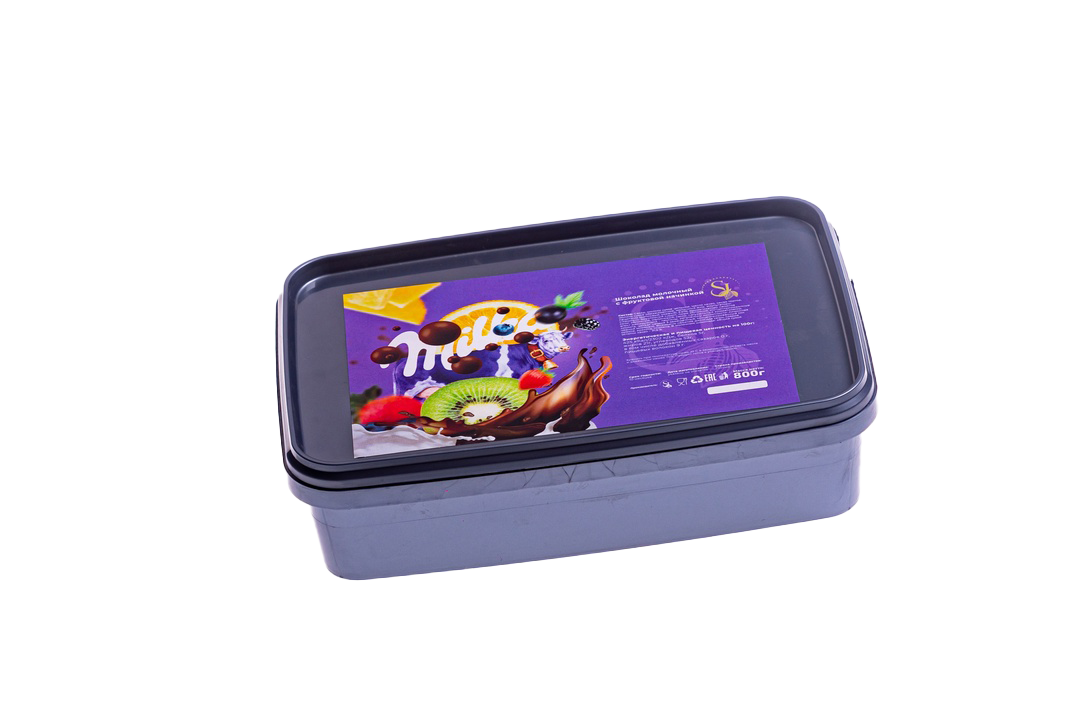 Молочный шоколад с фруктовой начинкой 800 грамм.Состав: сахар, молоко сухое цельное, масло какао, какао тертое, молоко сухое обезжиренное, молочный жир, эмульгаторы: лецитины (рапсовый, соевый), E476; ароматизатор), начинка (глюкозно-фрутозный сироп, пюре яблочное, концентрированные соки: яблочный, малиновый; сахар, натуральный ароматизатор, агент желирующий - пектины, регуляторы кислотности: лимонная кислота, цитрат натрия 3-замещенный; концентрированный сок черной моркови). Возможно наличие диоксида серы, следов орехов, арахиса, глютена. В молочном шоколаде: общий сухой остаток какао - 31,5%.